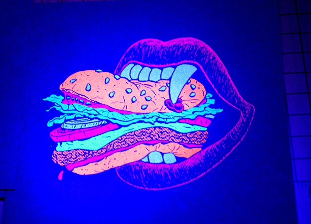 ・蛍光インク:ブラックライトに反応する顔料を調合してプリントします。対応色はピンク、レッド、イエロー、ライトグリーン。