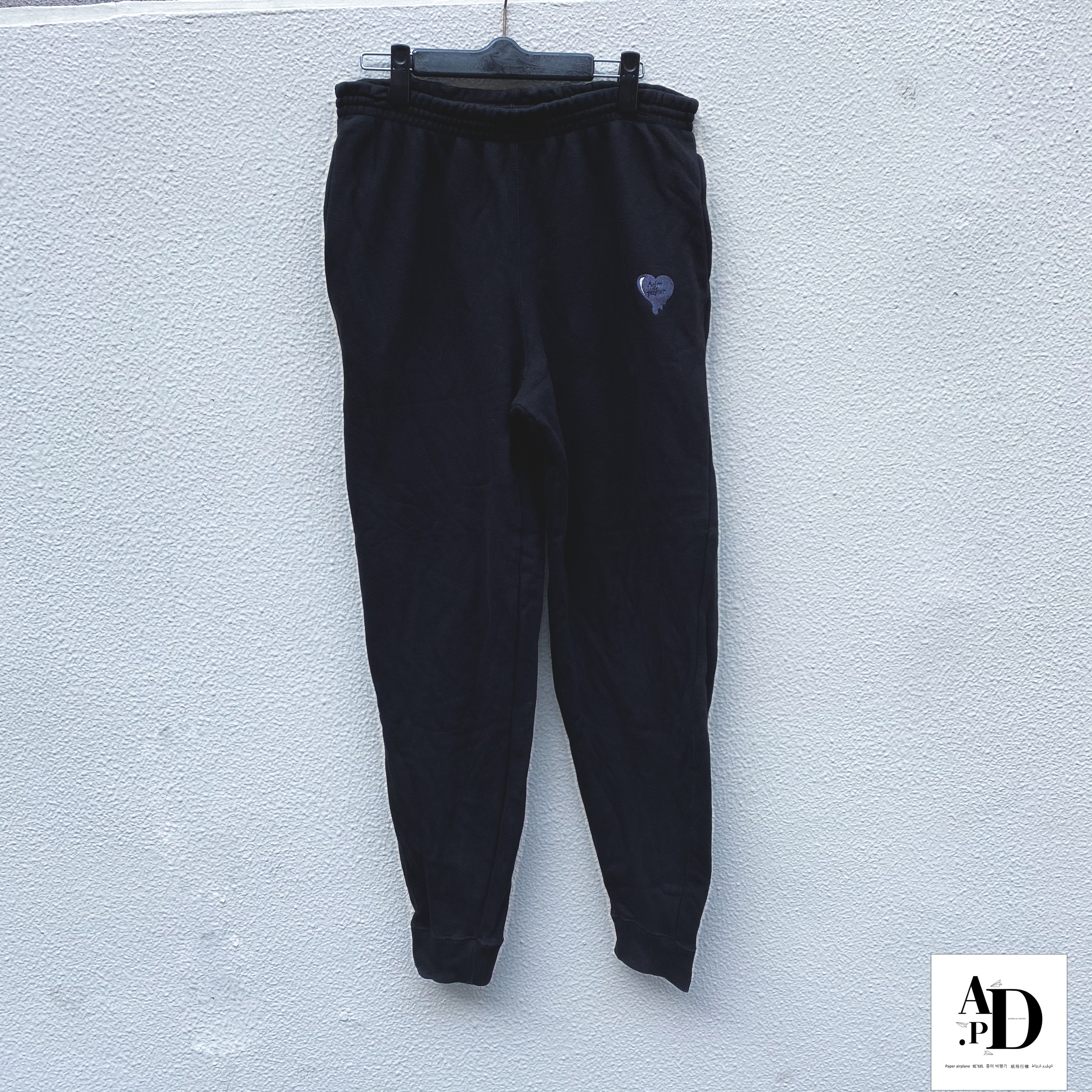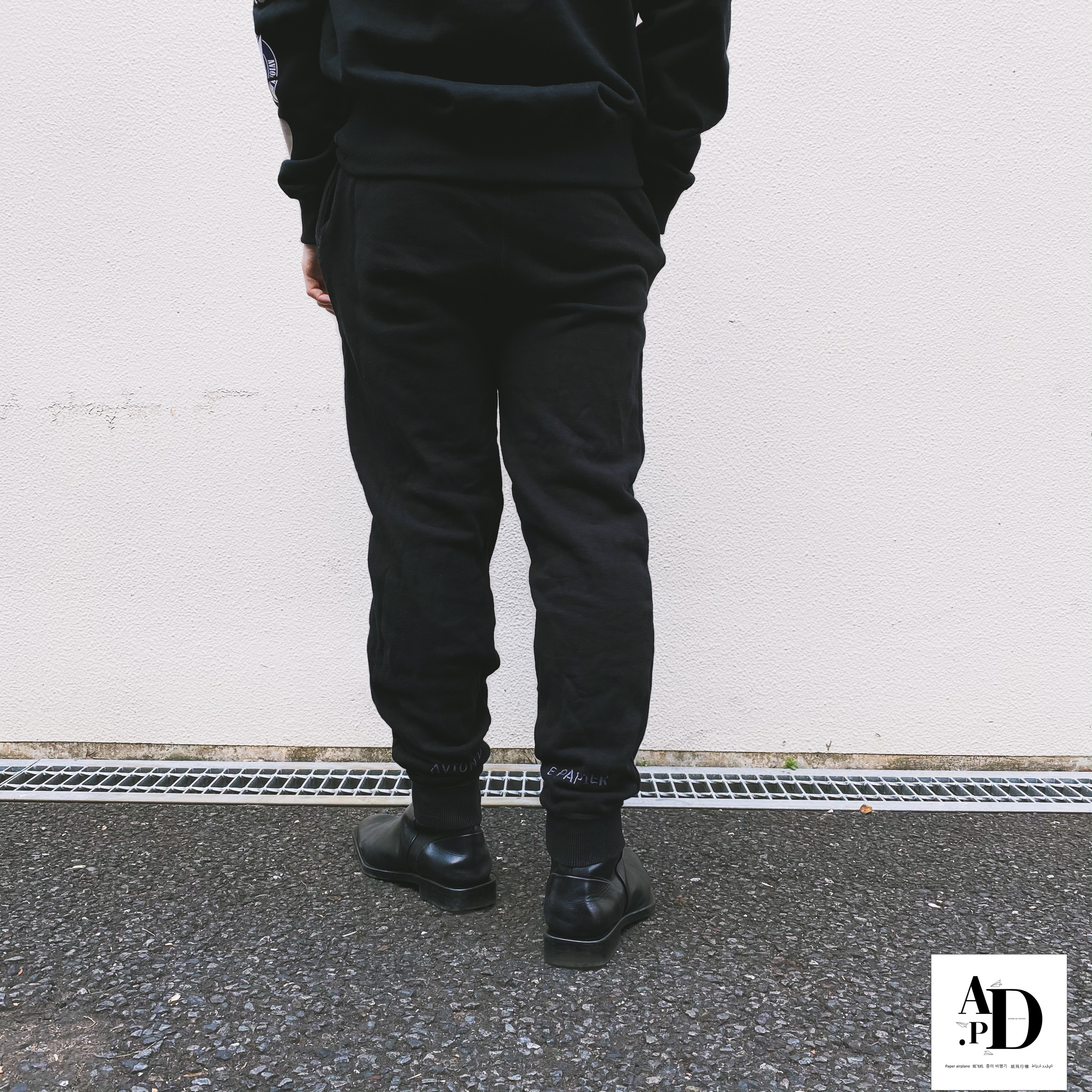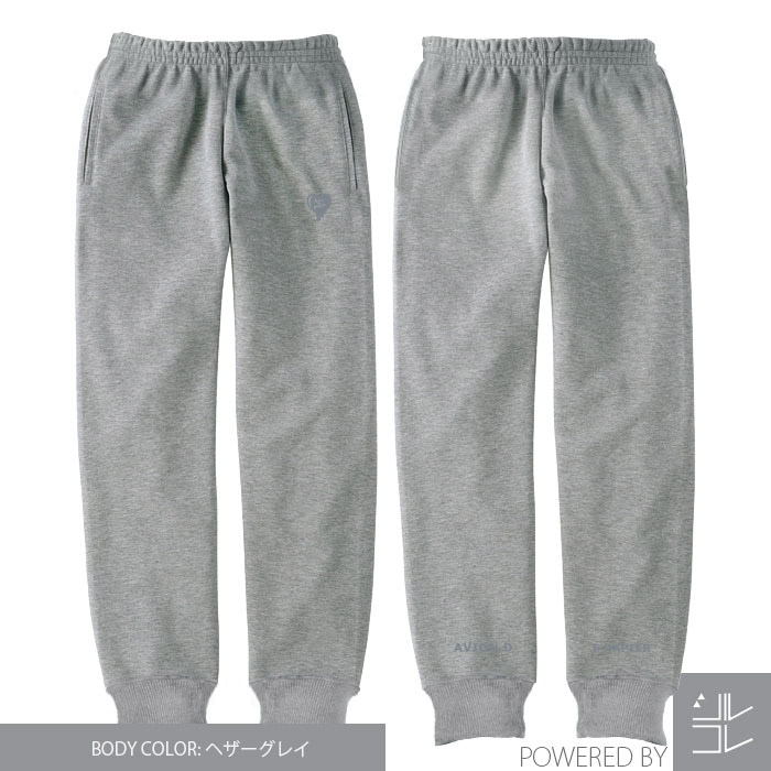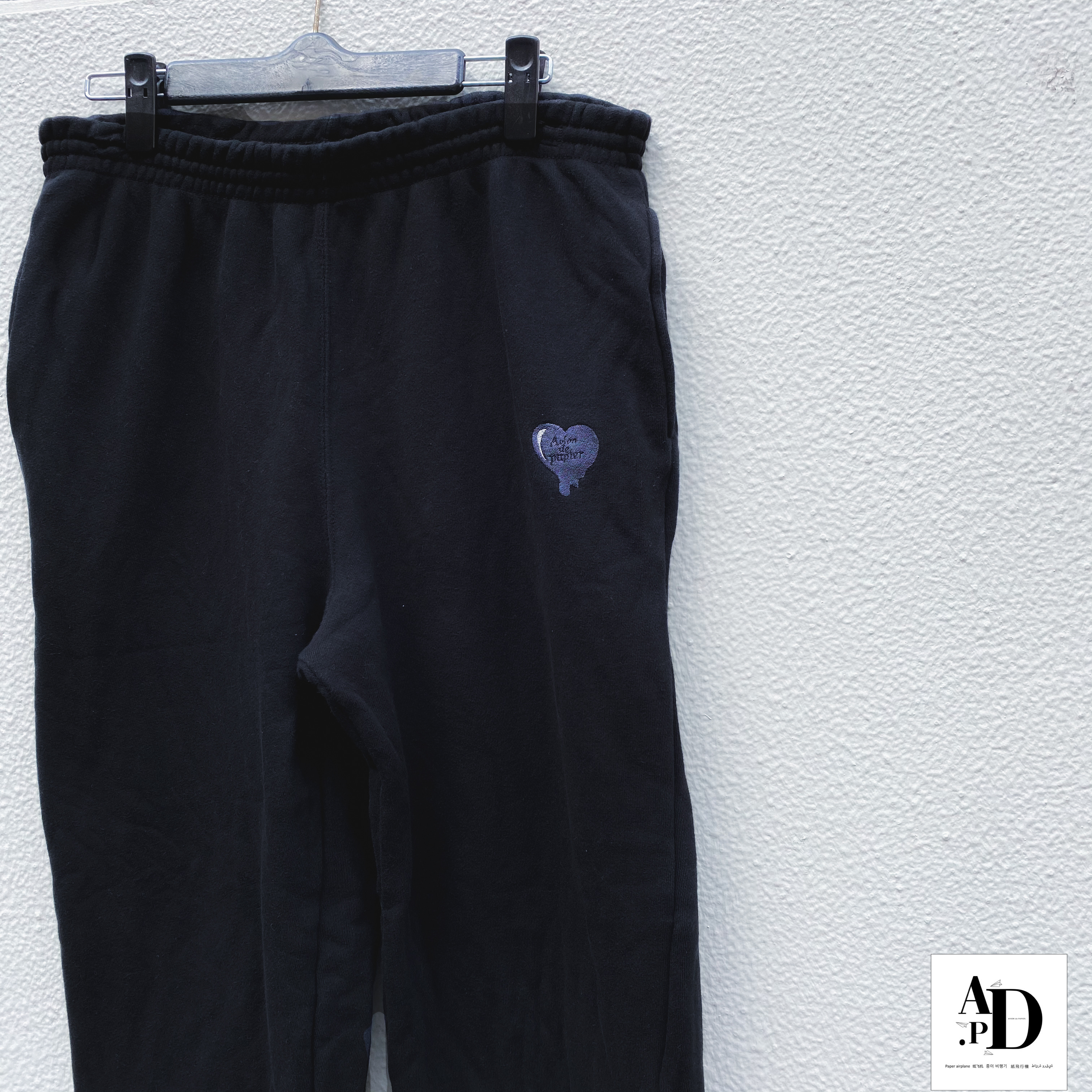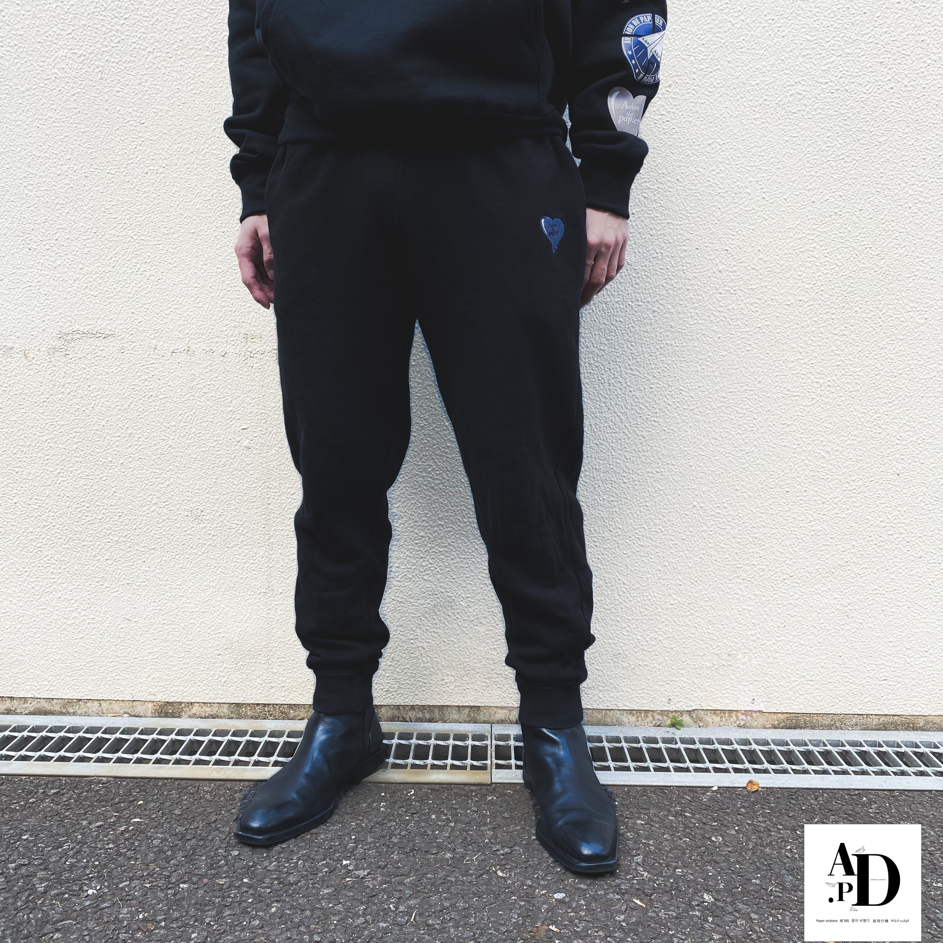 同系色でハートデザインをポケット付近に 刺繍を施し 背面の裾部分には AVION DE PAPIER を刺繍。 生地は厚めで裏地はパイル生地を使用。 動きやすさにも重視し若干テーパードのシルエットが効いています。 どのパーカーともセットアップで着用可能。 人と違うセットアップを堪能あれ。